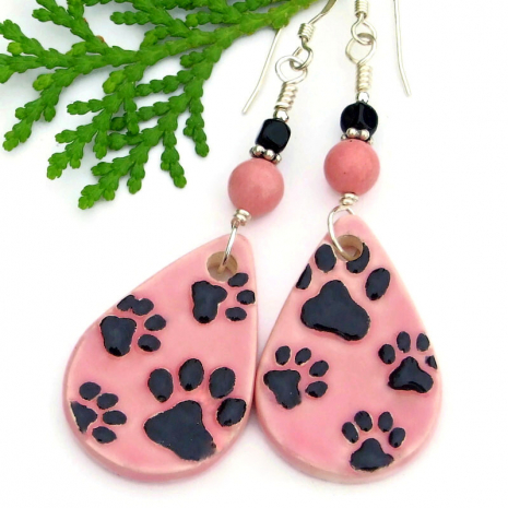 Boho-vibe black & pink paw print earrings w/ pink rhodonite & black onyx: perfect handmade jewelry gift for the dog lover! https://bit.ly/PawPrints1 via @ShadowDogDesign #sdftt #DogLover #DogEarrings