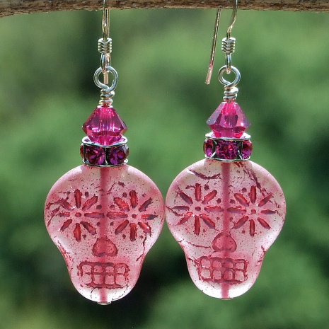 Wonderfully translucent Halloween jewelry: fun pink sugar skull earrings w/ metallic pink Picasso finish & sparkling Swarovski crystals! https://bit.ly/PinkSugarSkullsSD via @ShadowDogDesign #sdftt #HalloweenEarrings #SkullEarrings