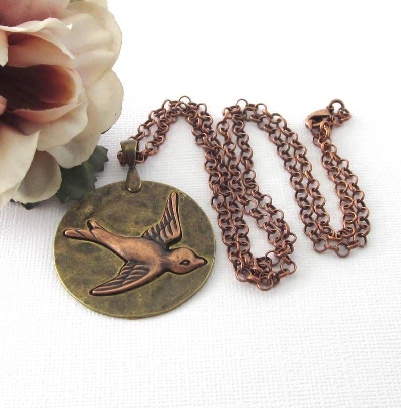 Bronze and Copper Swallow Bird Pendant Necklace Handmade by Connie of Thesingingbeader
