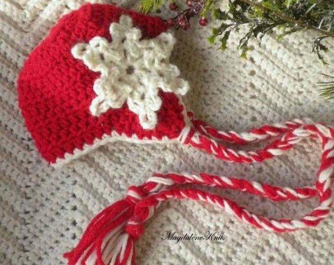 Crocheted Newborn Girl Red Hat with Snowflake Handmade by Pamela of MagdaleneKnits