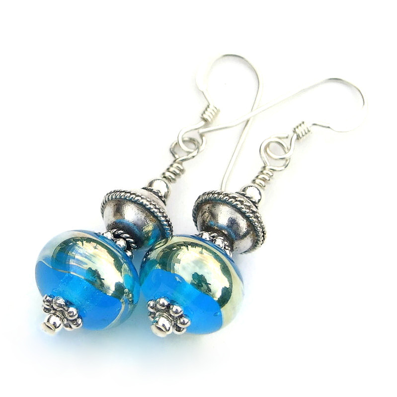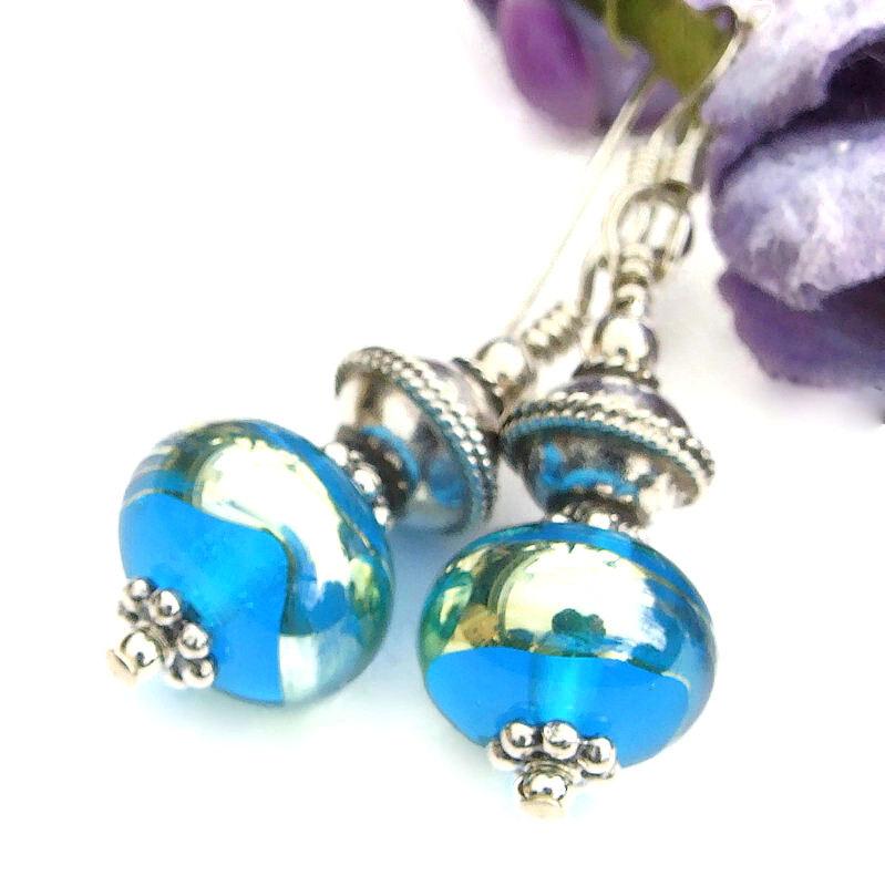 Aqua Blue Aurae Lampwork Earrings, Thai Fine Silver Handmade Jewelry