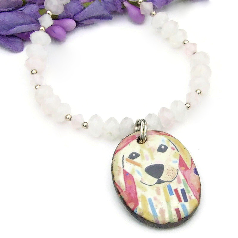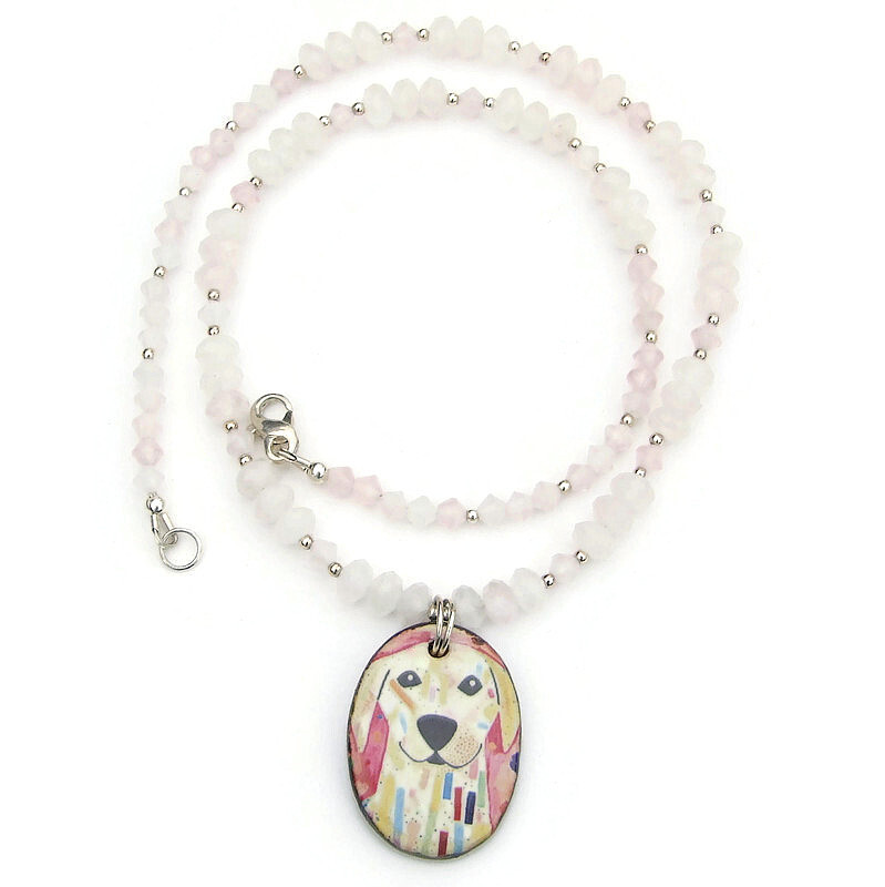 The one of a kind LOYALTY necklace is a wonderful handmade gift for the woman who adores her dog(s) and revels in their love and devotion. The necklace features an artisan ceramic dog head pendant, two shapes of pink rose quartz gemstones and sterling silver. Artisan made, the design on the porcelain ceramic pendant was created with an original dog head decal. And what a wonderfully whimsical design it is: a light colored dog looking lovingly at its human with a smile on its face. The colorful pendant was kiln fired for strength and durability. The pendant’s back side and edges have a dark brown glaze.