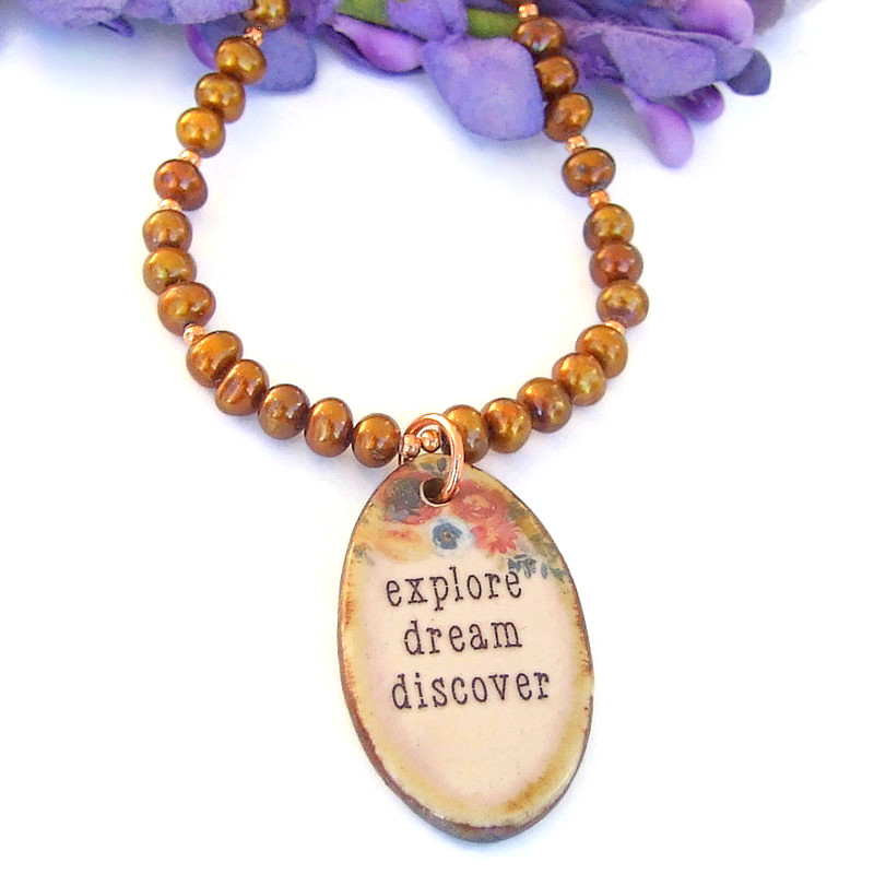 What a wonderful inspirational jewelry gift for the woman who has a huge dose of wanderlust in her blood! The EXPLORE DREAM DISCOVER handmade necklace features an artisan ceramic pendant, copper colored freshwater pearls with copper beads and a toggle clasp. The oval-shaped pendant was artisan handmade from porcelain clay and kiln fired four times for strength and durability. The words/image on the motivational pendant are permanent due to the multiple firings - they will not rub or scratch off. Against a peachy beige background, the brown words “explore dream discover” are found below a collection of colorful flowers. The back side and edges of the pendant have a dark brown glaze.