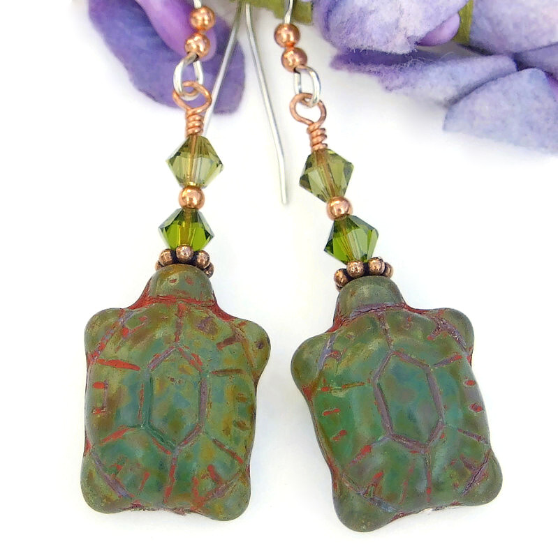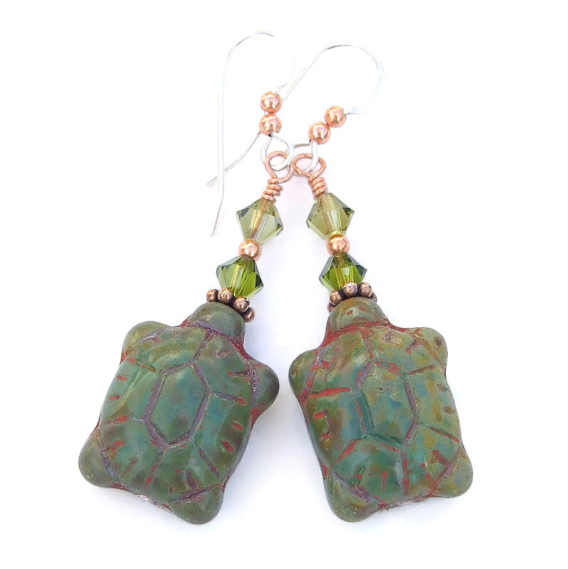 The TARTARUGAS handmade earrings are perfect for any woman who adores turtles, both in the water and on land. The one of a kind earrings feature translucent mossy green glass turtle beads, Swarovski crystals, copper and sterling silver. The turtle beads were created in the Czech Republic from premium quality pressed glass. The front of the beads are curved to resemble real turtle shells and have wonderful detailing. To bring out the detailing, a PIcasso finish of barn red and brown was added which settled into the recessed areas. The back side of the turtles is flat. The turtles were tightly wire wrapped and glued so they always face front. Since the mossy green glass is translucent, the turtles glow when the earrings are worn.