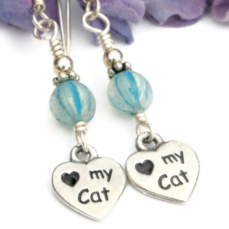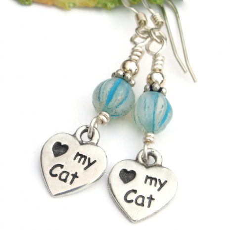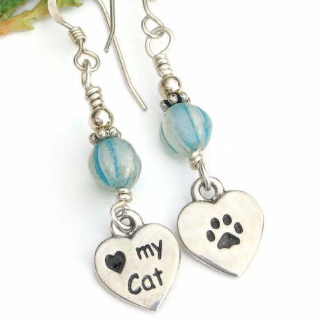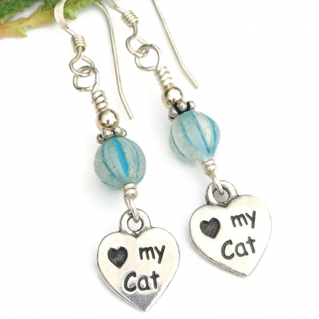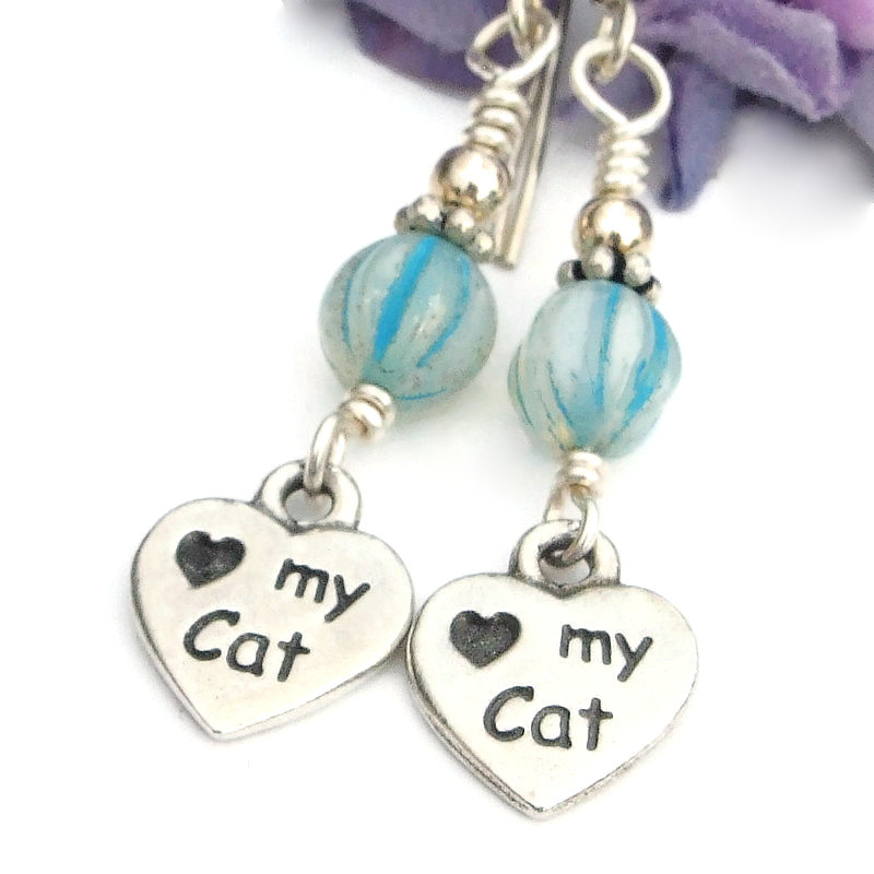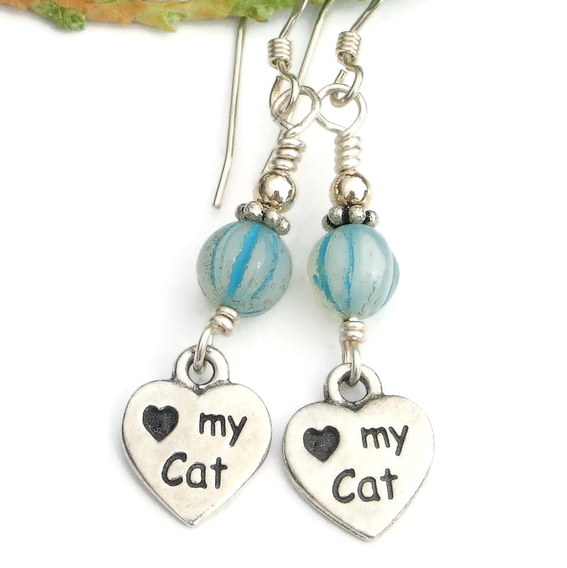 To add subtle beauty to the earring design, premium Czech glass melon beads are found above the charms. The ridged melon beads have a base of translucent white opal glass with an aqua blue Picasso finish to add a rustic look. Sterling silver daisy spacers and sterling beads cap the melon beads. Sterling silver French hook earwires finish the fun earrings. Carefully designed and handmade by Catherine of Shadow Dog Designs, the LOVE MY CAT earrings are a meaningful gift for the cat lover who adores one of a kind jewelry!