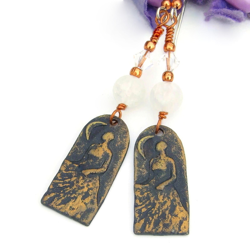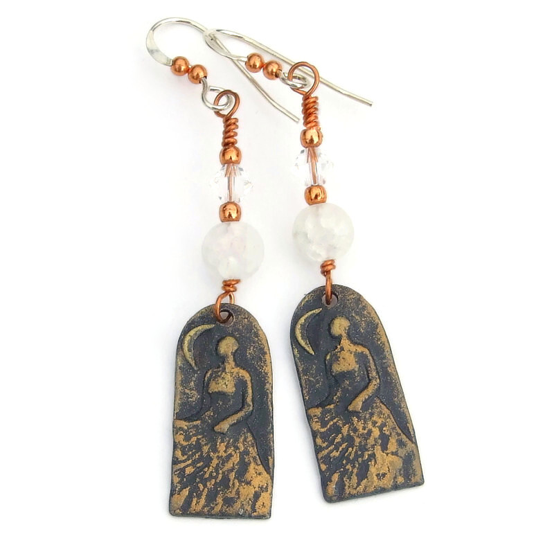 Moon Goddess Earrings, Bronze Quartz Handmade Celestial Jewelry Gift