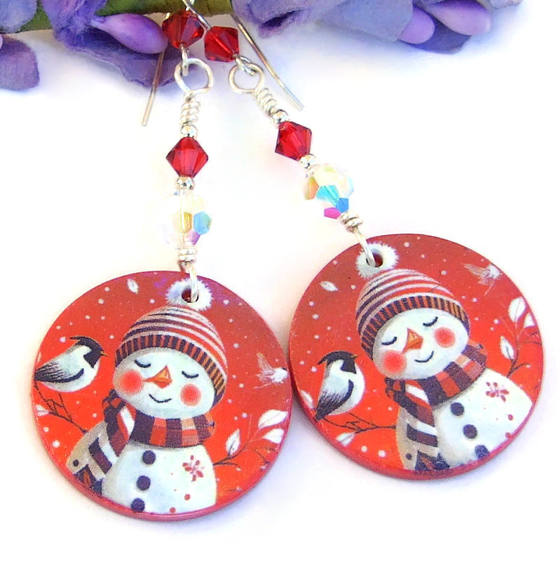 Handmade jewelry that is guaranteed to make you smile, the HOLIDAY SNOWMEN earrings are perfect to wear the entire Christmas season! The unique earrings feature artisan snowmen dangles, two colors of Swarovski crystals and sterling silver. The fun round dangles were individually made from medium red polymer clay with a permanent transfer on the front. A whimsical winter scene is found: a snowman with a smile, closed eyes and red cheeks wearing a striped beanie and a scarf. To add more playfulness, a small crested bird is perched on one of the snowman’s stick arms. The backside is smooth brick red. Since the Christmas dangles are made from polymer clay, the earrings are very lightweight to wear.