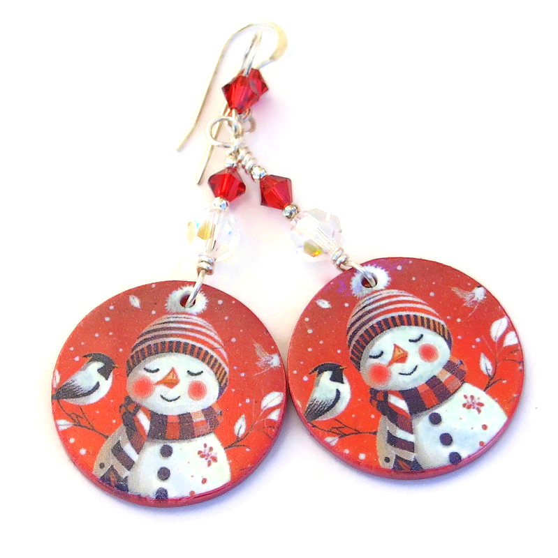 Snowmen Birds Christmas Earrings, Red White Handmade Holiday Jewelry