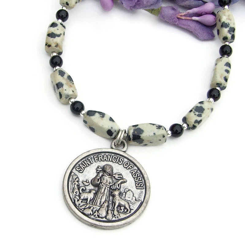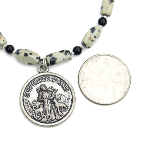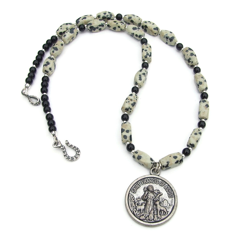St Francis Protect My Pet Necklace, Dalmatian Jasper Handmade Jewelry