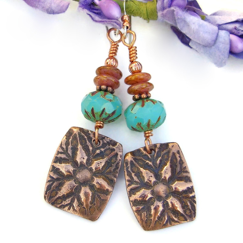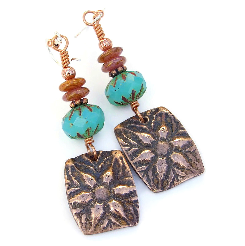 Named after the many flowers that have a star petal look, the one of a STAR FLOWERS earrings are a perfect gift for a flower lover. The lightweight, handmade earrings feature artisan made copper flower charms, aqua opaline Czech glass beads, pink rose Czech glass discs, copper and sterling silver. Individually artisan handmade from pure copper, the rounded rectangular shaped charms have a raised six petaled flower design with a textured background. To bring out the design and to add an antiqued look, the slightly convex flower charms were given a dark patina and then polished to bring out the raised floral design. The back of each dangle has an unpolished patina.