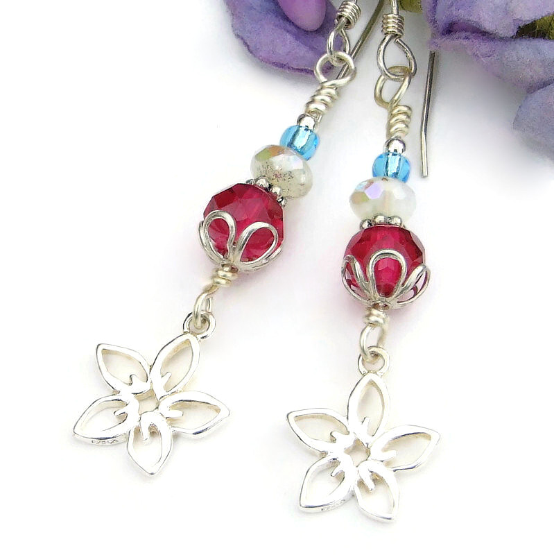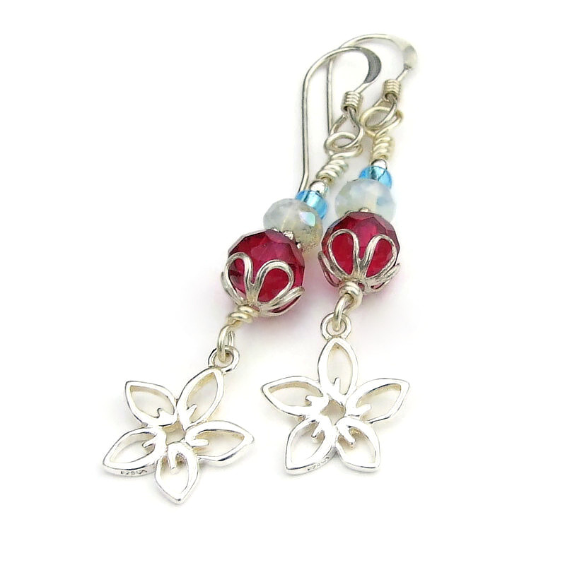 Beautifully one of a kind jewelry for spring and summer wear, the FLEURS handmade are wonderful feminine and lightweight! These beauties feature sterling flower charms, raspberry red Czech glass, white opal Czech glass, aqua glass beads and sterling silver. The sterling charms are based on the gorgeous plumeria flowers with a unique cut out design. The charms have five star-like petals, detailing around the center disc and are stamped with .925 (showing they are sterling) on the edge of each. The back side of the charms are smooth.