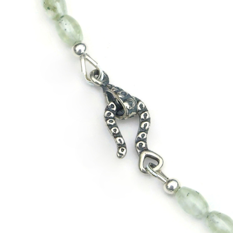 Unique handmade jewelry that is filled with ancient symbolism found in many ancient (and modern) cultures, the CRANN BETHADH necklace features a glowing mother of pearl Tree of Life pendant, green prehnite gemstones, Austrian crystals and sterling silver. The beautiful Tree of Life pendant was intricately hand carved from white mother of pearl. Just look at the amazing cut out details: a majestic tree raising its branches to the heavens. Like all mother of pearl, the tree pendant has a high sheen (which the photos, don’t show, unfortunately), with some pale pinks and greens showing up when the light hits it just right. The back of the pendant is smootn and doesn’t show all the detailing from the front (photo #10).