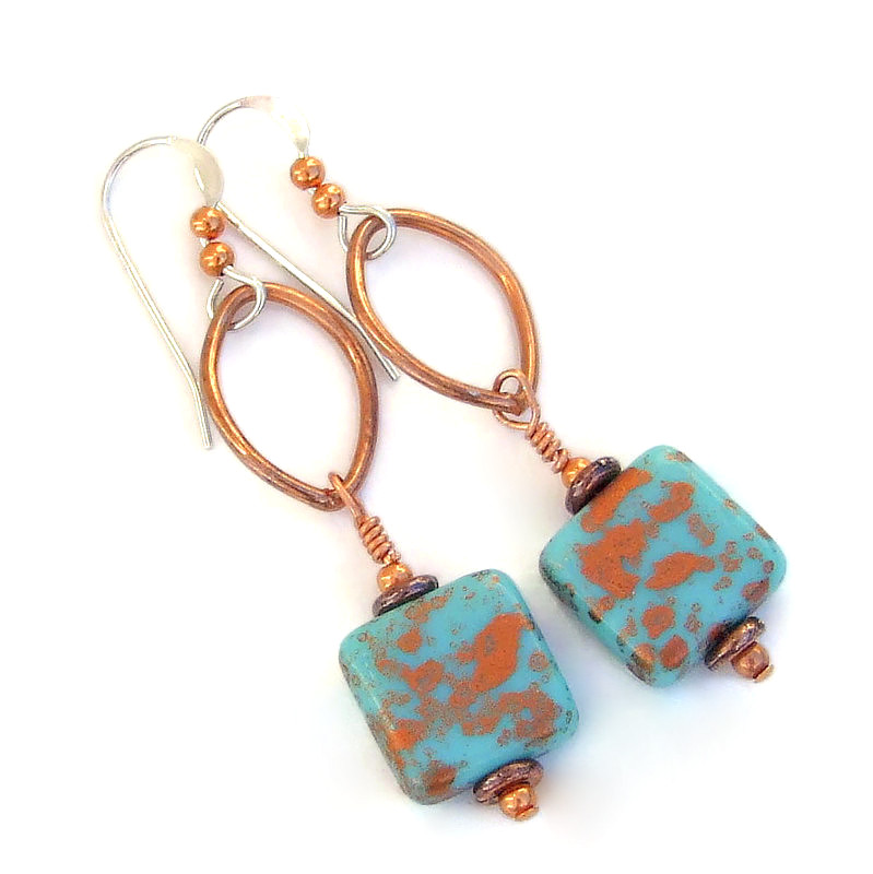 The unique TURQUOISE CRAZE handmade earrings are eye-catching, lightweight and so much fun to wear! One of a kind jewelry, the artisan earrings feature turquoise and copper splash Czech glass squares, marquise shaped copper links, copper findings and sterling silver. Made in the Czech Republic, the glass squares were created from shiny turquoise glass. A vivid, random metallic copper splash design was applied to the front, back and sides. As you can see in the photos, each side is different. The copper splashes absolutely glow against the turquoise color, glistening when the light hits the copper just right. Because the turquoise and copper squares are two-sided, the earrings look fabulous from any angle when worn.