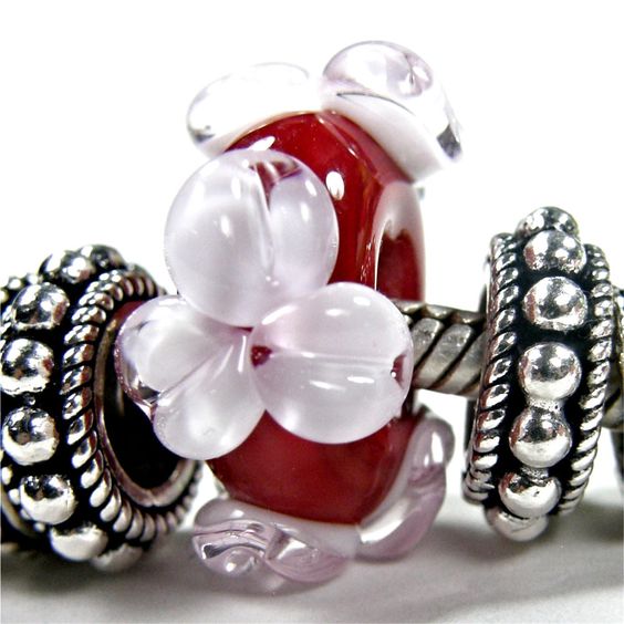 Red and Pink Large Hole Lampwork Glass Flower Bracelet Beads Handmade by Charlotte of Covergirlbeads