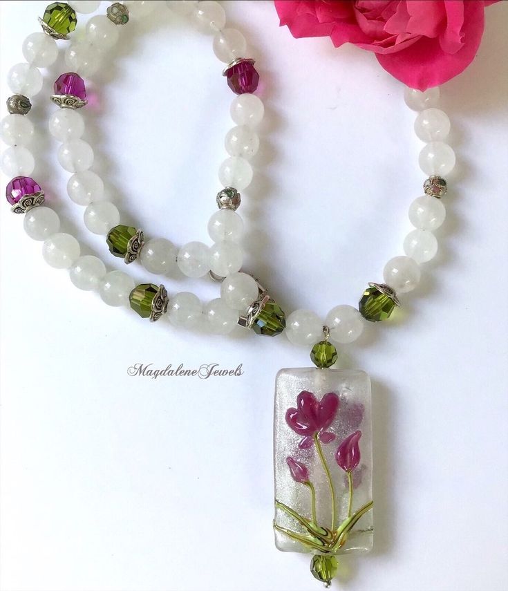 Lily Pond and Flowers Lampwork Glass Pendant Necklace Handmade by Hema of BeadedNecklaceShoppe