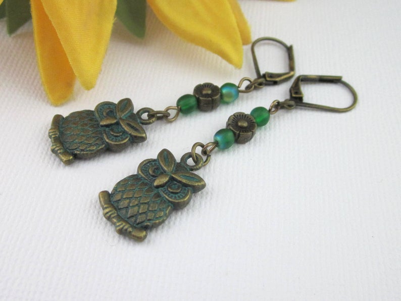 Patina Verdigris Bronze Owl Charm Earrings with Lever Backs Handmade by Connie of Thesingingbeader