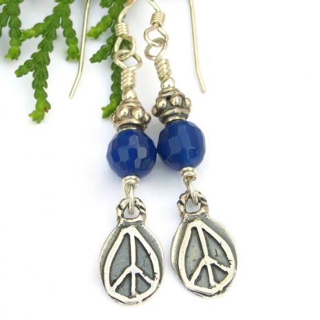 Meaningful, sweet & petite jewelry for Mom: rustic two-sided peace sign / paz charm earrings w/ faceted blue quartz & granulated Bali silver beads! https://bit.ly/PazSD via @ShadowDogDesign #sdftt #MothersDay #PeaceSignEarrings