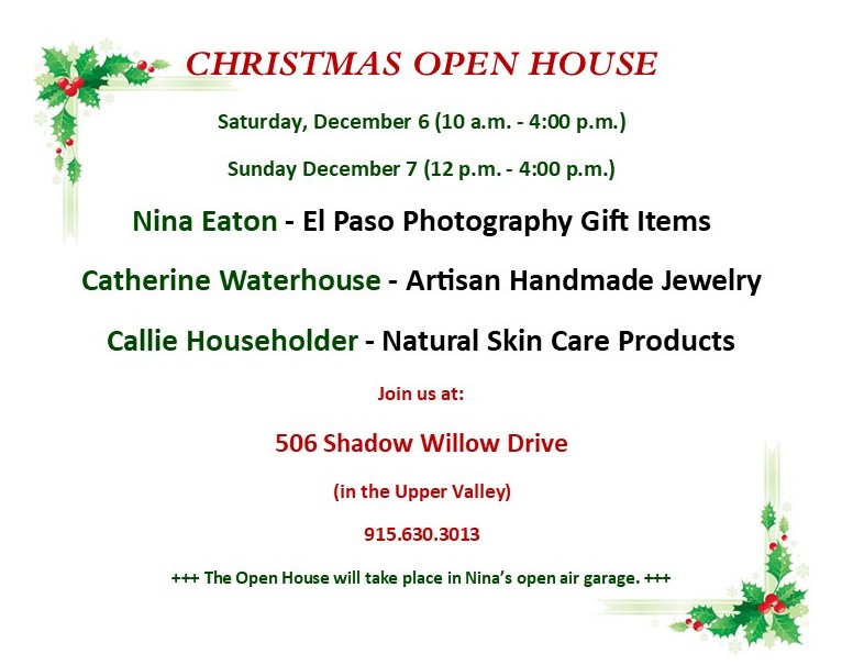 Shop local this holiday season! This year the annual Christmas Open House features 3 artists. Stop by to find unique presents / stocking stuffers: photographic gifts, handmade jewelry & natural skin care items! https://bit.ly/OpenHouseDec2025 via @ShadowDogDesign #sdftt #ElPaso #Blog
