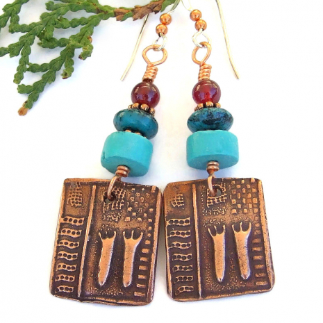 Perfect handmade jewelry for the woman who loves petroglyphs: unique artisan copper shaman earrings w/ real turquoise & red garnet! https://bit.ly/LoreAncients via @ShadowDogDesign #sdftt #ChristmasGift #ShamanEarrings