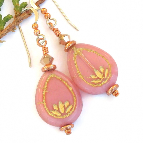Meaningful jewelry for the yoga lover: pink & bronze Czech glass lotus flower earrings w/ sparkling rose gold Swarovski crystals! https://bit.ly/Renge via @ShadowDogDesign #sdftt #YogaJewelry #FlowerEarrings