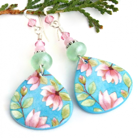 Beautiful floral handmade jewelry for spring & summer wear: lightweight pink magnolias earrings w/ frosted pale green lampwork & pink Swarovski crystal accents! https://bit.ly/PinkMagnoliasSD via @ShadowDogDesign #sdftt #ShopSmall #FlowerEarrings
