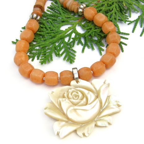 Fab handmade jewelry for the flower lover: radiant vintage hand carved mother of pearl rose pendant necklace w/ peach calcite & shell heishe! https://bit.ly/RosetteSD via @ShadowDogDesign #sdftt #ChristmasGift #FlowerNecklace