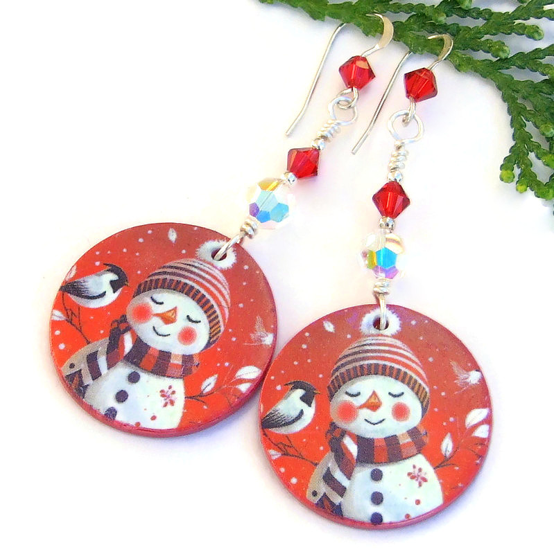 Whimsical handmade holidays jewelry gift for women: lightweight red & white smiling snowmen & birds earrings w/ glittering Swarovski crystals! https://bit.ly/HolidaySnowmen via @ShadowDogDesign #sdftt #ChristmasGift #ChristmasEarrings