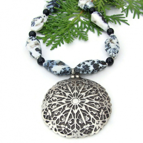 Beautiful handmade jewelry for the woman who loves the timelessness of mandalas: filigree-style matte silver mandala pendant necklace w/ tree agate & black onyx! https://bit.ly/UnitySD via @ShadowDogDesign #sdftt #ChristmasGift #MandalaNecklace