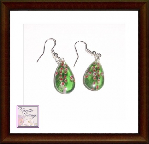 Millefiore Green Glass Tear Drop Pierced Dangle Earrings Handmade by Jacki of Christie Cottage
