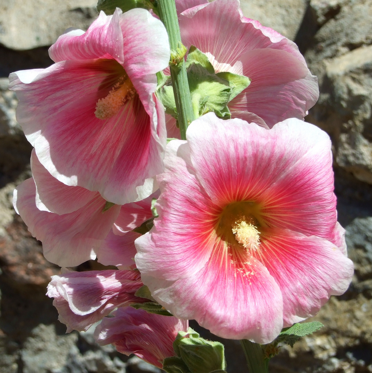 This hollyhock looks like the darker pink has been applied with a paint brush against the pale pink.