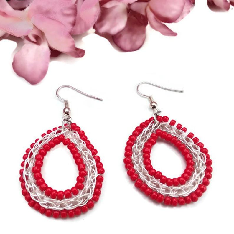 Hand Crocheted and Red Beaded Viking Chain Hoop Earrings Handmade by Cathy of MorganJewelryDesign