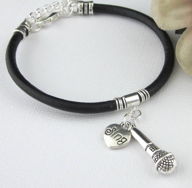Microphone Charm Bracelet With Black Leather Cord Handmade by Connie of Thesingingbeader