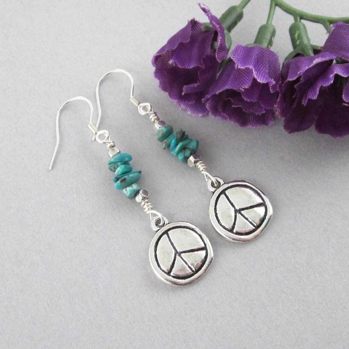 Peace Sign Earrings with Natural Turquoise Chips Handmade by Connie of Thesingingbeader