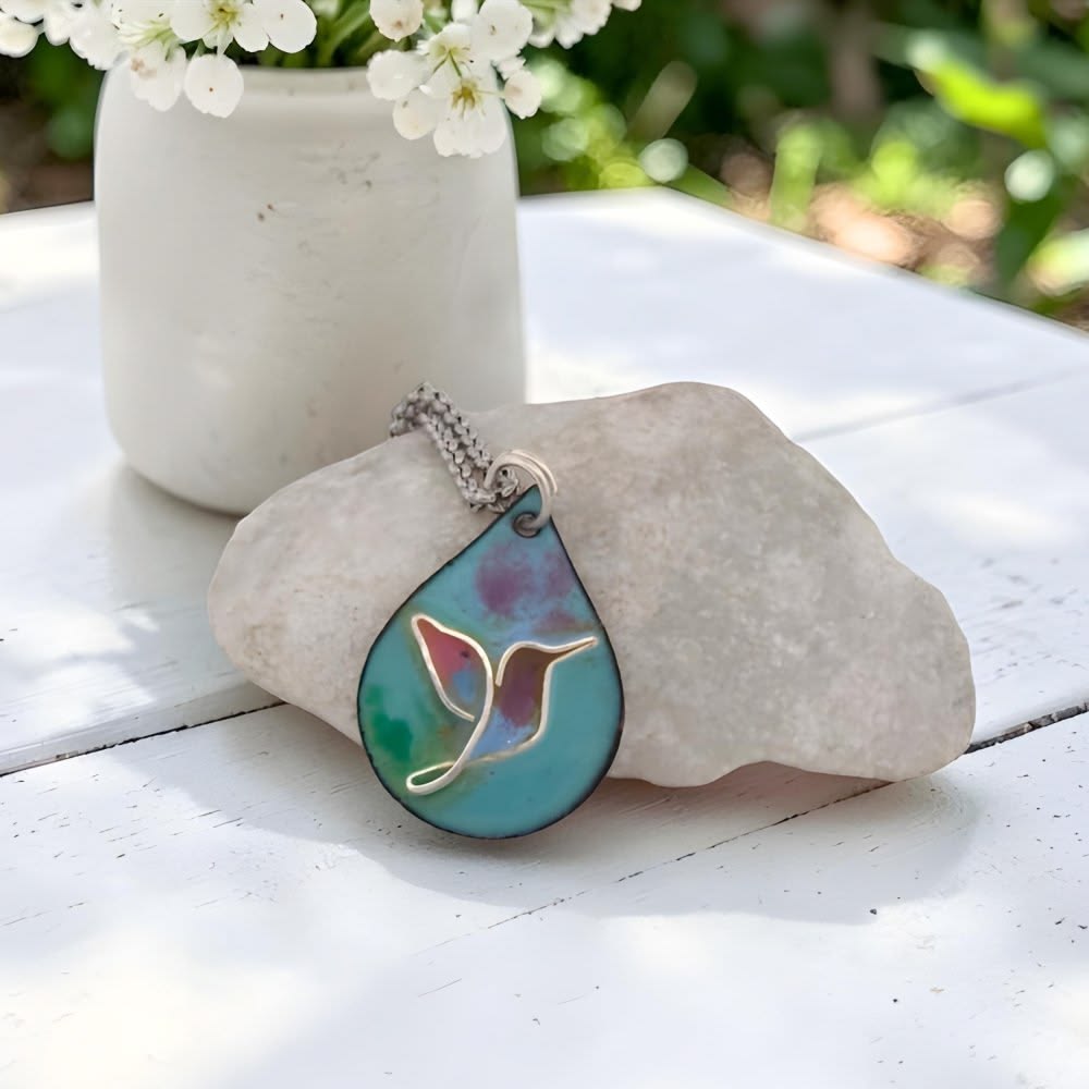 Enamel Cloisonne' and Fine Silver Hummingbird Pendant Necklace Handmade by Rina of Pure Whimsy