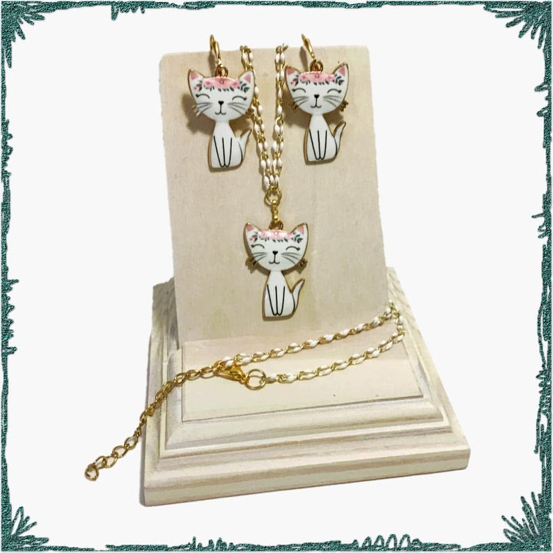 White Enamel Kitty Cat Necklace and Earrings Jewelry Set Handmade by Hema of BeadedNecklaceShoppe
