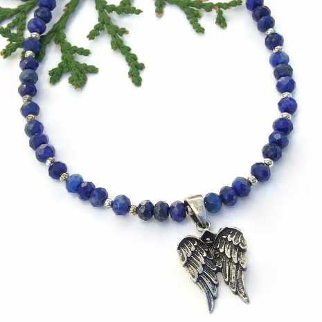 ANGELI - Sterling Silver Angel Wings Necklace with Faceted Lapis Lazuli Gemstones