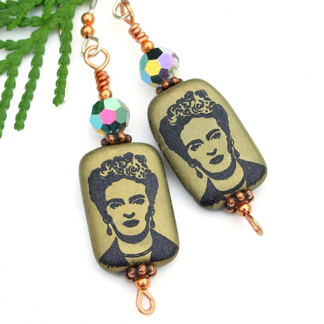 Laser Etched Gold and Black Frida Kahlo Earrings with Color-shifting Faceted Swarovski Crystals