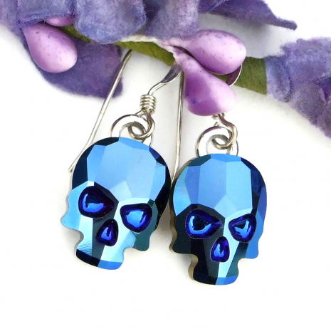 METALLIC BLUE SKULLS - Metallic Blue Skull Earrings, Swarovski Halloween Handmade Jewelry - $20.00