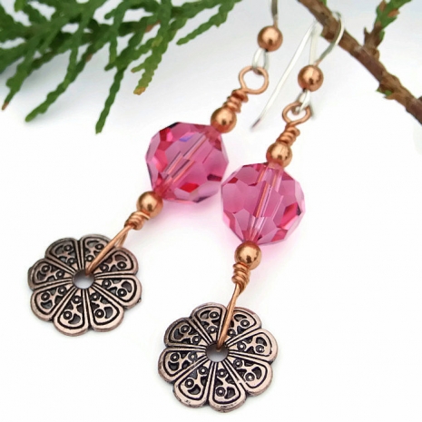 IRRESISTABLE - Filigree Flower Earrings, Valentines Copper Pink Swarovski Handmade Jewelry for Women - $25.00