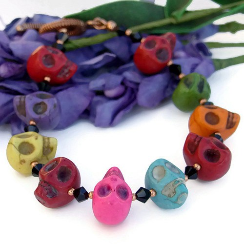 Skulls and sparkles together? You bet, right here with this DAY OF THE DEAD handmade bracelet! A unique, fun DIA DE LOS MUERTOS bracelet, it was created with eye-catching multi colored side-drilled magnesite skulls, "jet" Swarovski crystals and copper. The bracelet shows that skull jewelry is a definite fashion statement year round. Designed and carefully handmade by Catherine of Shadow Dog Designs, the grinning cheerfulness of this DAY OF THE DEAD BEAUTY will make you smile!