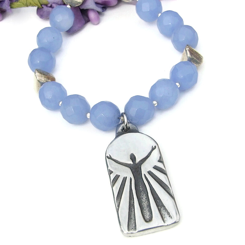 A woman with raised arms is a symbol for thankfulness, gratitude, love and praise to the Higher Power.  Pewter is believed to be very grounding, bringing the wearer back to reality. Blue Agate is valued for its ability to calm the mind.  Silver is a metal of love and healing; it is a mirror to the soul, helping us to see ourselves as others see us.