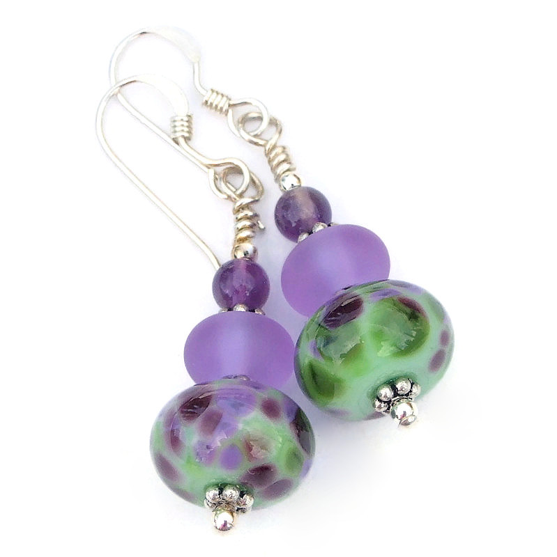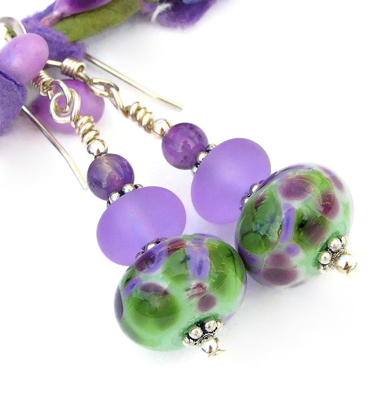 Inspired by the breathtaking beauty of purple wisteria vines, the WISTERIA handmade earrings are definitely eye catching! A one of a kind jewelry gift for the flower lover, the wisteria-inspired earrings feature mottled shades of purple and green lampwork beads, frosted lilac lampwork beads and purple amethyst gemstones. The lampwork glass beads on the bottom were individually artisan made from opaque white glass. While still in their molten stage, dark purple, lilac, lavender and green glass frit were added to give the enchanting speckled look. Since the high gloss lampwork beads are individually handmade, they are very similar but not exactly the same.
