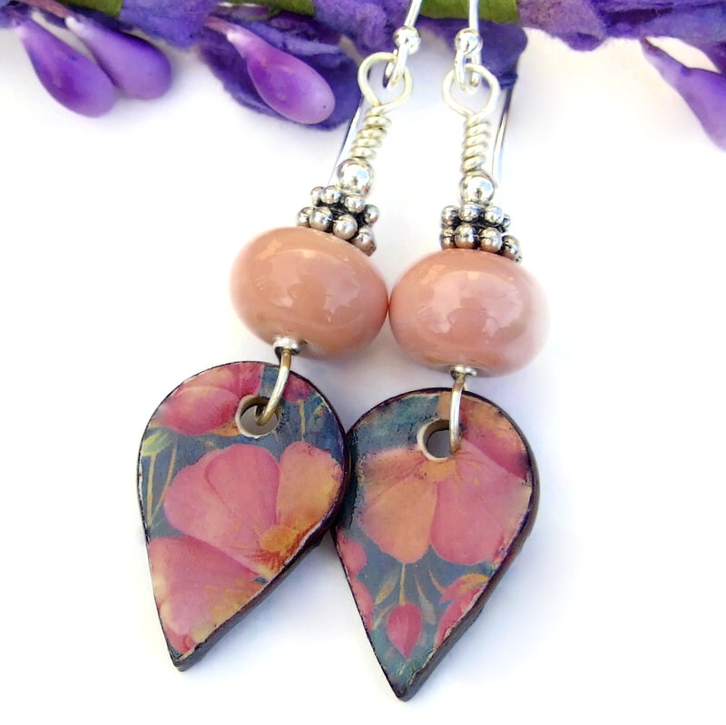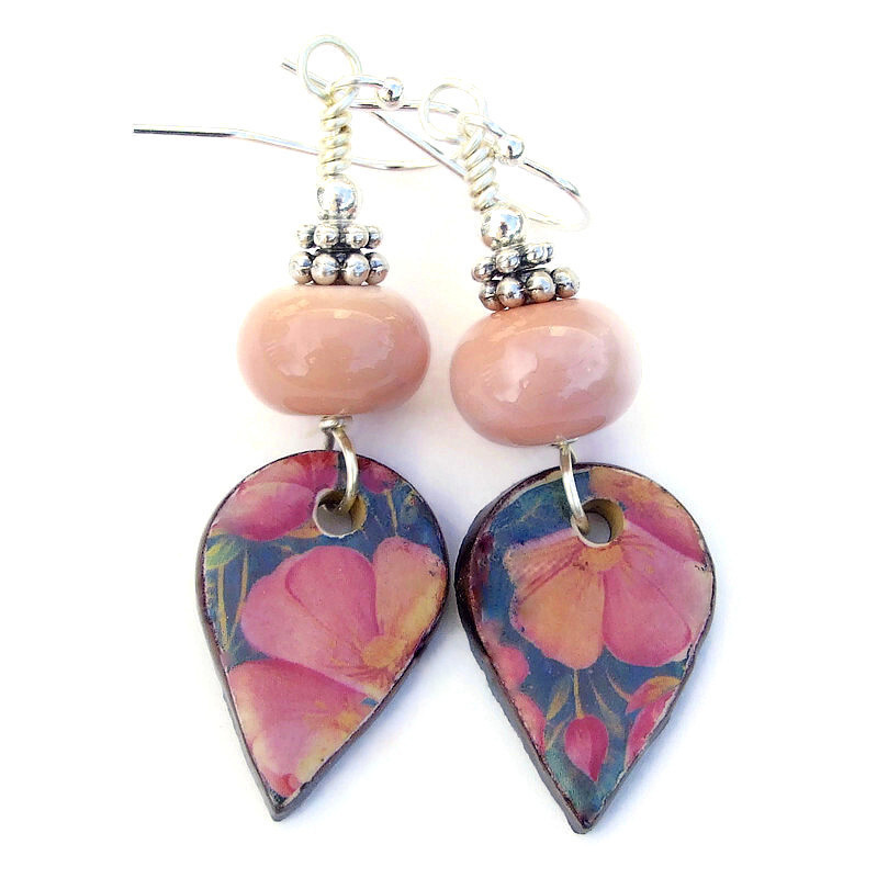 The BREATHTAKING BLOOMS handmade earrings are such beauties and are extremely lightweight to wear. Jewelry for the flower lover, the one of a kind earrings feature artisan ceramic flower dangles, artisan lampwork glass beads and sterling silver. The reverse teardrop-shape charms were individually artisan made from porcelain ceramic with a permanent floral transfer on the front of each and a high shine glaze. The flowers are delicate looking (maybe pansies) in shades of pink and orange on a dark background with a few green leaves and stems. To add unexpected eye appeal, the charms are different from each other. The sides and back have a high sheen dark brown glaze.