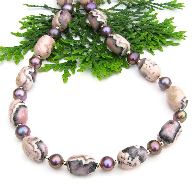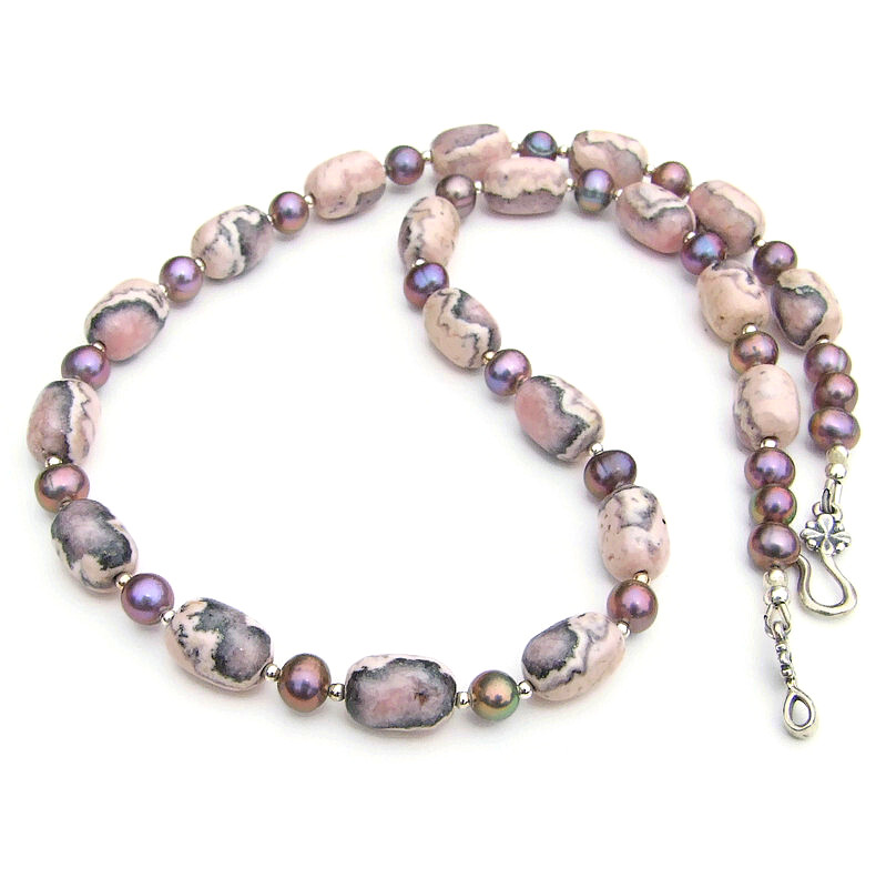 Breathtakingly beautiful handmade jewelry to wear all year long (but especially in spring and summer), the one of a kind BELLEZZA necklace features genuine rhodochrosite gemstones, peacock pearls and sterling silver. A fairly rare gemstone, the eye-catching rhodochrosite barrels are natural, not dyed. The beads are primarily shades of light pink with darker pink areas surrounded by gray banding, each high sheen rhodochrosite gemstone is different from all the others.