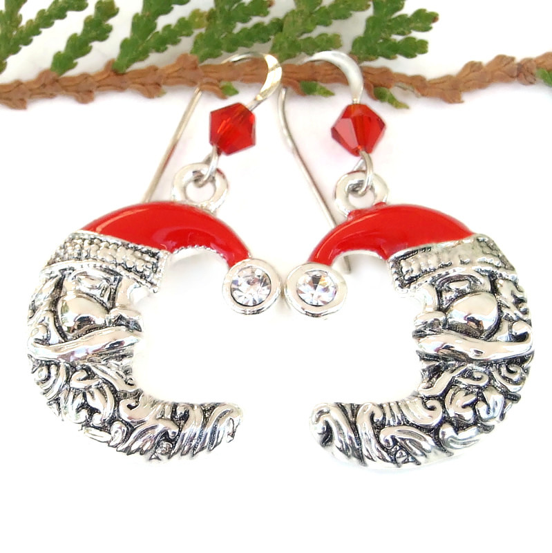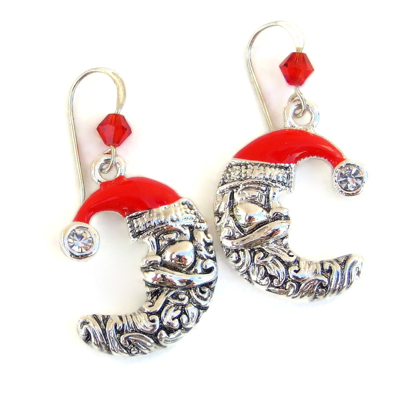 Santa Moons Christmas Earrings, Red Silver Handmade Holiday Jewelry