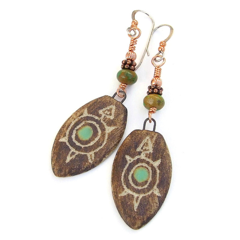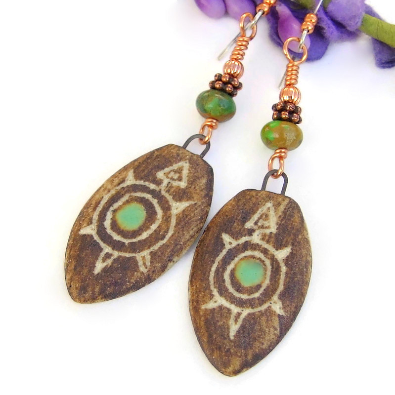 The one of a kind TSISTEEL petroglyph-inspired earrings are a wonderful handmade jewelry gift for the turtle lover in your life! The earrings feature artisan ceramic turtle charms, real turquoise, copper and sterling silver. The unique shield shaped ceramic turtle charms were individually made with a medium brown glaze on the front. To give a distressed look, a sgraffito method was used: a glyph turtle design was carefully hand etched onto each charm, revealing the lighter, off-white ceramic underneath. A dot of minty green glaze was added to the inner circle of the turtle's shell. Since the dangles were singly made, they are very similar in design but there are also differences. The back of each charm has a light wash of the brown glaze over the off white ceramic.