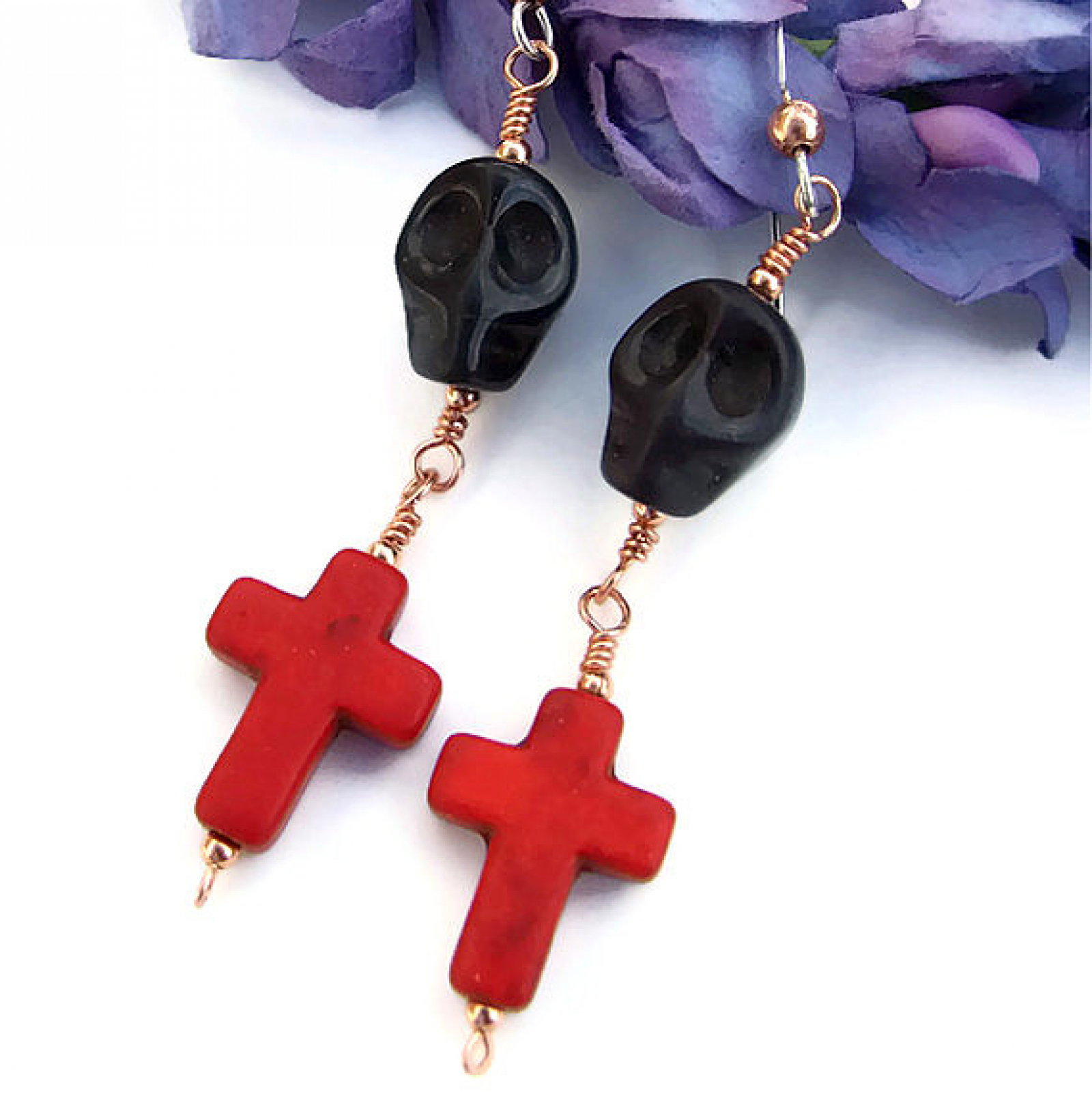 To add fabulous movement to the earrings and to give a Goth feel, red magnesite crosses were carefully wire wrapped to the bottom of the skulls. Not only was the magnesite used to make the crosses dyed, but they were also given a blotchy finish of darker spots to impart an old feel to them. A perfect match to the black of the skulls! As with the skulls, the crosses are also framed with 2mm copper beads at the top and bottom and then carefully wire wrapped to the bottom of the skulls.