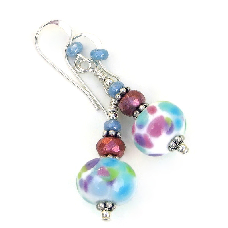 Speckled Lampwork Earrings, Purple Pink Blue White Handmade Jewelry